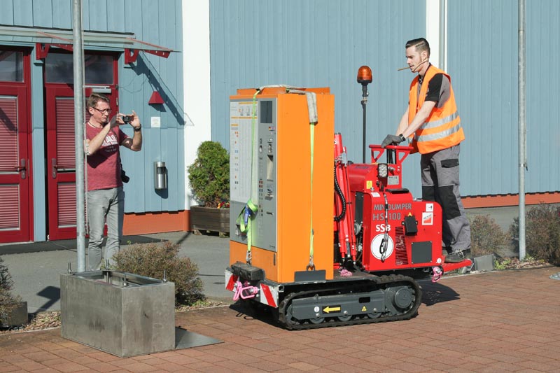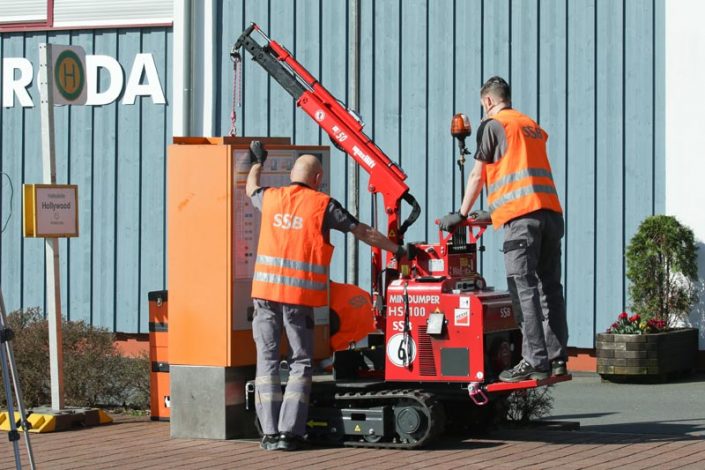 Im Einzugsbereich der SSB sind viele Fahrscheinautomaten (FAA) verteilt. Nun kommt es immer mal wieder vor, dass die FAAs ausgetauscht, versetzt oder abgebaut werden müssen. Sie wiegen allerdings 280 kg und stehen gern an schlecht zugänglichen Plätzen. Schmale Bahnsteige oder Treppen etc. müssen passiert werden. Um den Mitarbeitenden diese Arbeit zu erleichtern, wurde 1998 ein kleiner Elektrostapler als Transport- und Aufstellfahrzeug eingesetzt. Die Gabeln wurden durch einen „Galgen“ ersetzt, so können die Fahrscheinautomaten hängend mittels Traverse befestigt und transportiert werden. Gegen das „Herumpendeln“ gibt es keine Sicherung, damit wurde ein Mitarbeitender betraut.